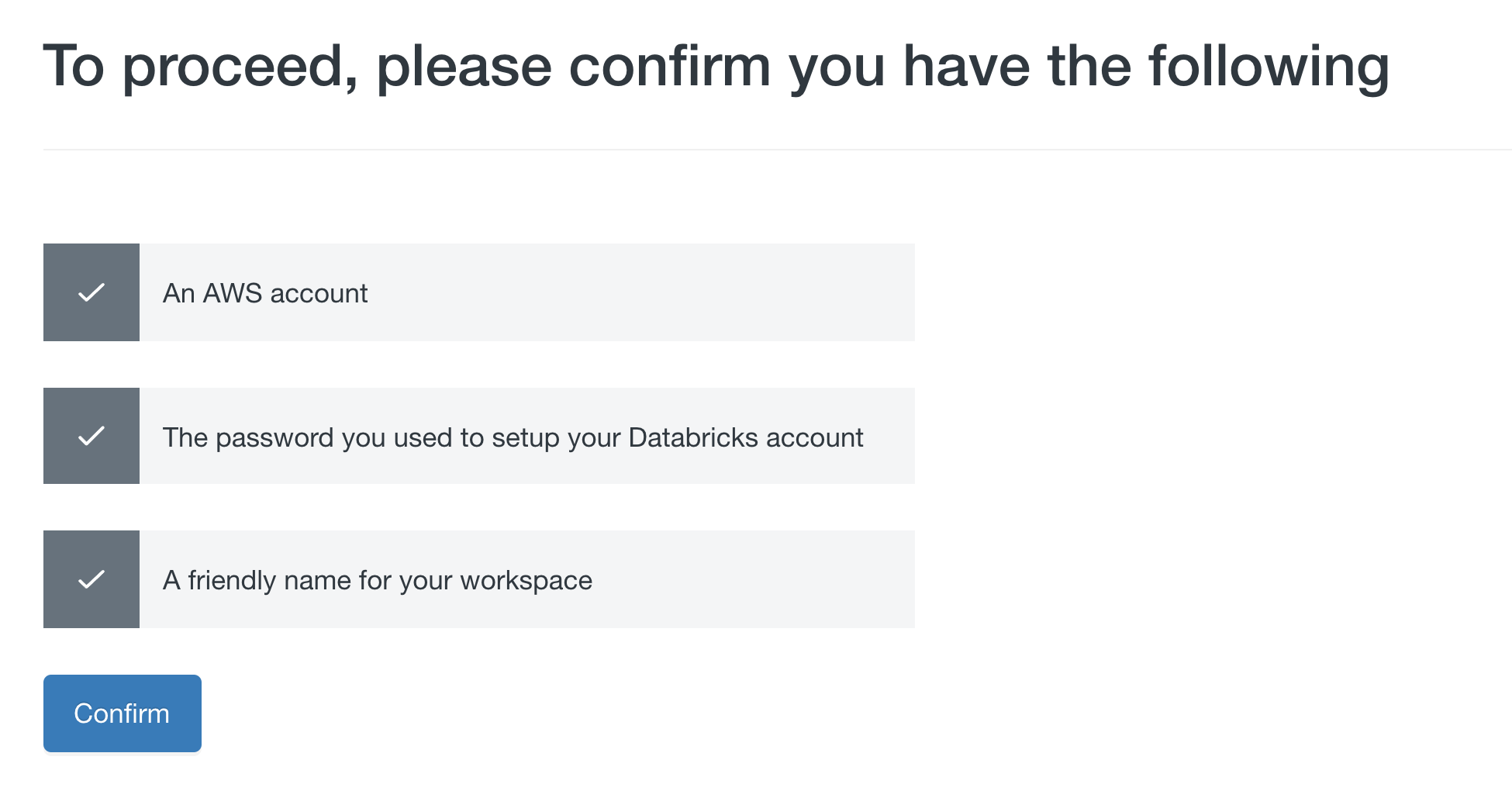 6. Now it's time to create your first workspace. A Databricks workspace is an environment for accessing all of your Databricks assets. The workspace organizes objects like notebooks, SQL warehouses, clusters, etc into one place. Provide the name of your workspace and choose the appropriate AWS region and click Start Quickstart. You might get the checkbox of I have data in S3 that I want to query with Databricks. You do not need to check this off for the purpose of this tutorial.
